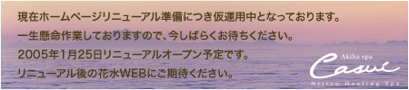 さあ、2005年もスタートしたばかり・・・ 昨年以上に充実した年になりますように!! これからも「花水」は、お客さまの声を大切にし、笑顔いっぱいでがんばります。 また、HPでも最新のプラン情報や楽しい情報をいち早く掲載していきますので、 どうぞよろしくお願いいたします。(毎月25日更新) 〜お知らせ〜 ロアジールにて期間限定キャンペーンを実施いたします。 詳しくは下記「ロアジール情報」へ 1月・2月は休まず営業いたします。 花水で"ほっこりほころぶ"ひと時をお過ごしください。 |